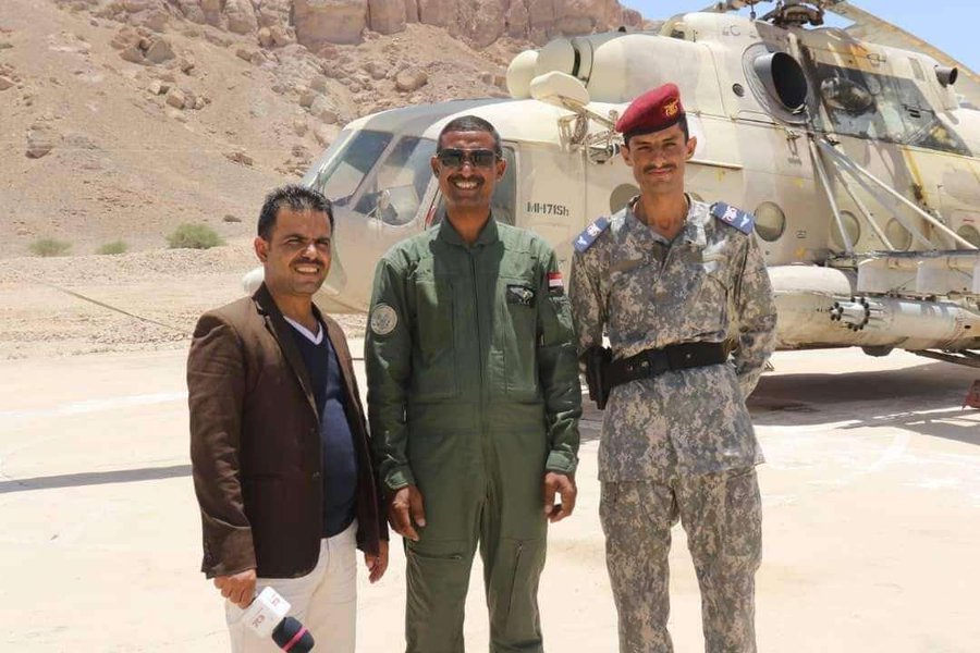 وتداول ناشطون صورة لطاقم الطائرة الهليكوبتر التي انقذت الجرحى مشيرين إلى أن الطيار يدعى عبدالحكيم المعافري.
