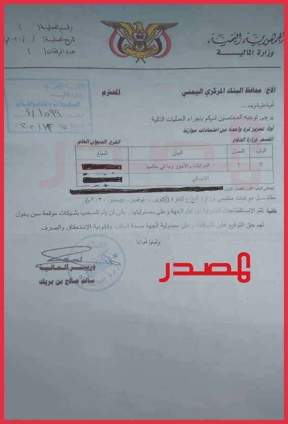 والوثيقتان التي حصل عليهما "المصدر اونلاين" عبارة عن مذكرتي تغطية لرواتب الستة الأشهر الأخيرة للعام 2020 موجهة من وزير المالية سالم صالح بن بريك إلى البنك المركزي، صدرت الأولى بتاريخ 2020/10/29 برقم 1326/9، والثانية بتاريخ 2020/12/7 وتحمل الرقم 1599/9. (الوثائق أدنى الخبر)