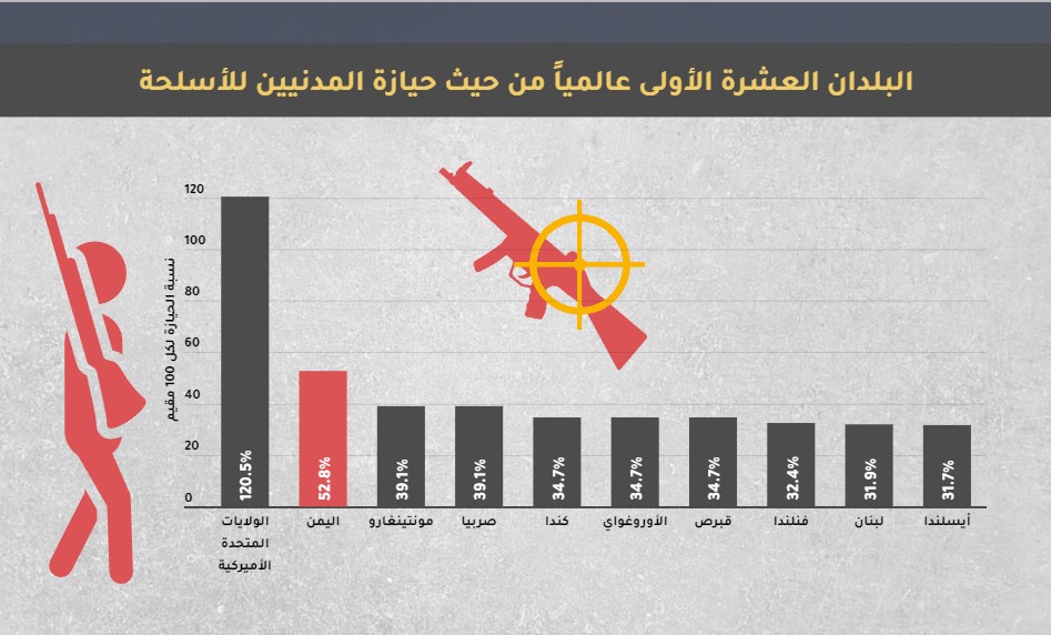 وأسهم عدم تطبيق القانون في أن يصبح اليمن في الترتيب الثاني بعد الولايات المتحدة، من حيث حيازة المدنيين للأسلحة، بإجمالي 14.900 مليون قطعة سلاح، وفق ما رصده المعهد العالي للدراسات الدولية والإنمائية في جنيف، بمسح الأسلحة الصغيرة المنشور في يونيو/حزيران 2018.
