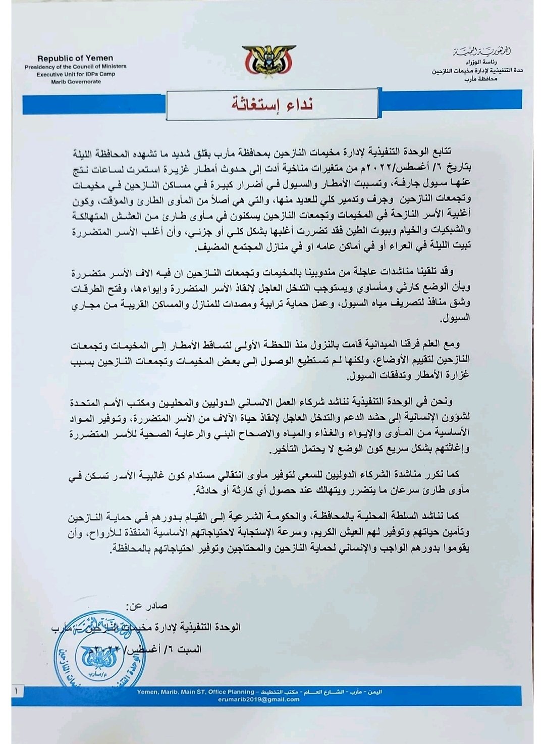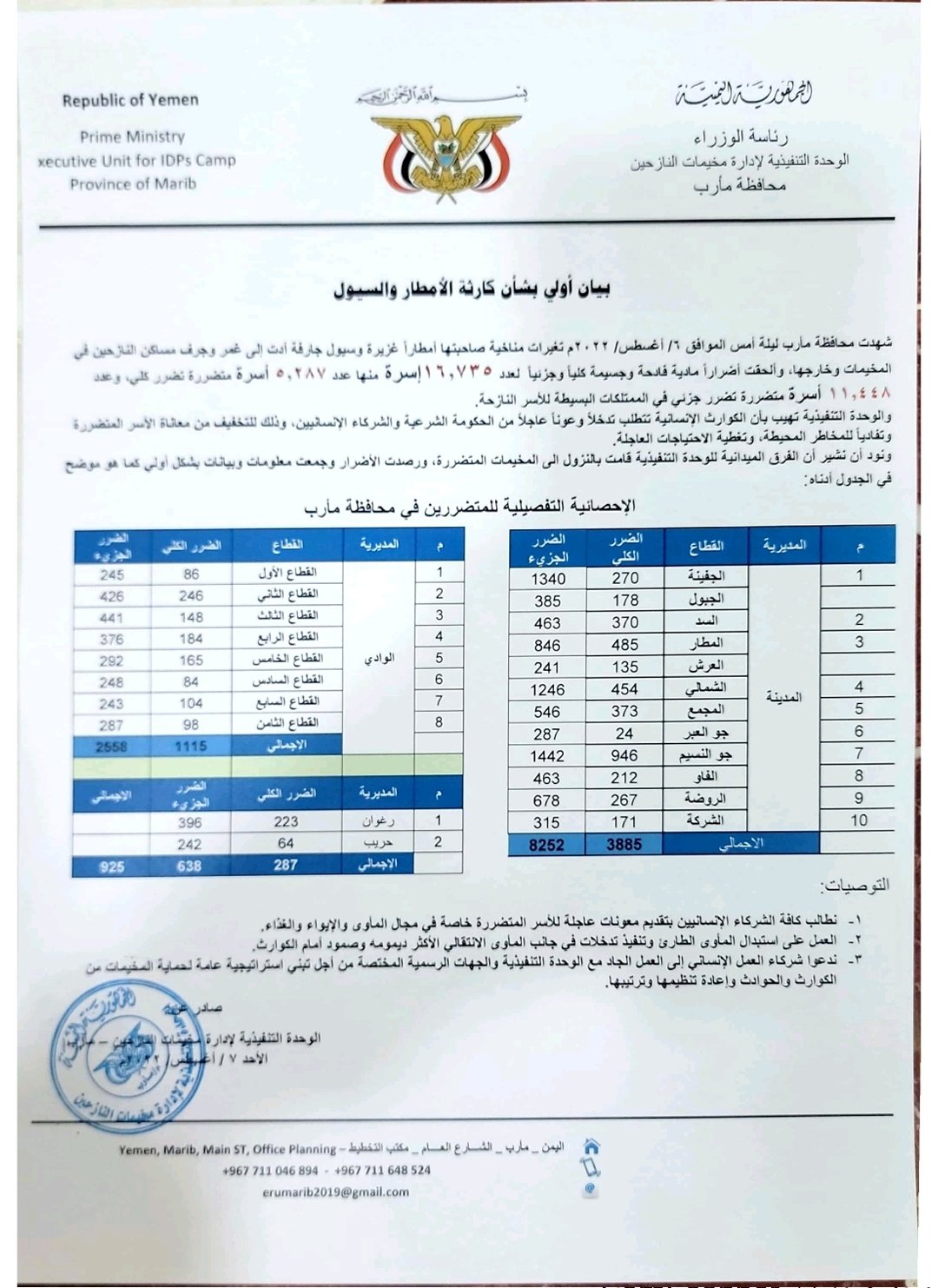 وأكدت الوحدة (وهي هيئة تابعة للحكومة اليمنية) في بيان اولي اليوم الأحد، إن السيول والأمطار الجارفة التي شهدتها محافظة مأرب، مساء أمس، أدت إلى غمر وجرف منازل النازحين في المخيمات وخارجها، وألحقت أضرارا مادية جسيمة..