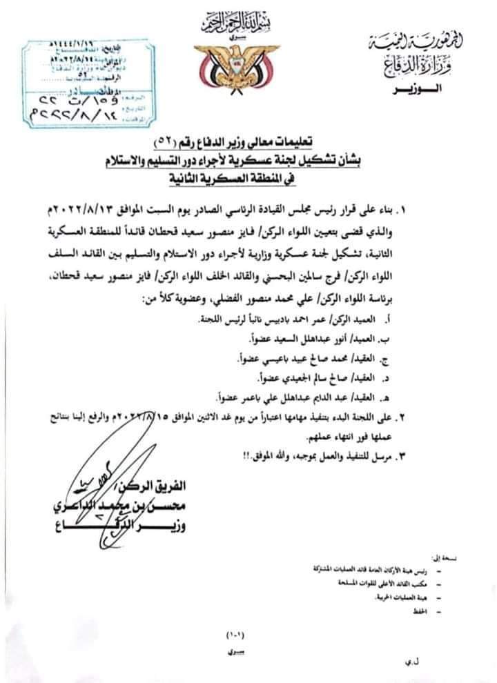 والرسالة التي يشير إليها البحسني هي رسالة تشكيل لجنة “استلام وتسليم” برئاسة اللواء الركن علي محمد منصور الفضلي، وهو نائب رئيس هيئة الاسناد بوزارة الدفاع، ويفترض أن تكون اللجنة بدأت عملها من يوم الاثنين 15 أغسطس/آب.