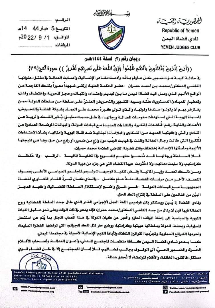علن نادي القضاة اليمني في مناطق سيطرة مليشيات الحوثي المدعومة من ايران إضراباً مفتوحاً، عن العمل في جميع المحافظات، التي يسيطر عليها الحوثي احتجاجاً على خطف وإعدام القاضي محمد حمران عضو المحكمة العليا.