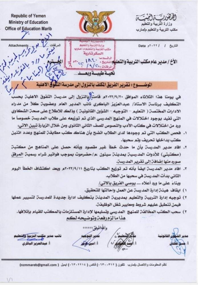 مأرب.. إيقاف مدرسة أهلية وإحالة ادارتها للتحقيق (وثيقة)