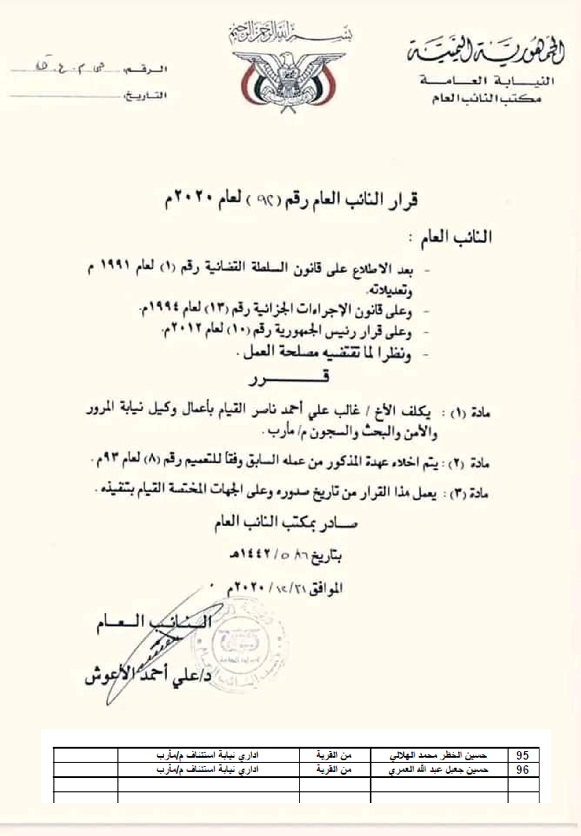 ومن بين هؤلاء أبناء الدكتور الأعوش: "غالب علي أحمد، وكيل نيابة الأمن والبحث والسجون بمأرب، وناصر الأعوش وكيل النيابة الابتدائية، وحسين وزيد ومحمد عينوا في وظائف أخرى بالنيابة".