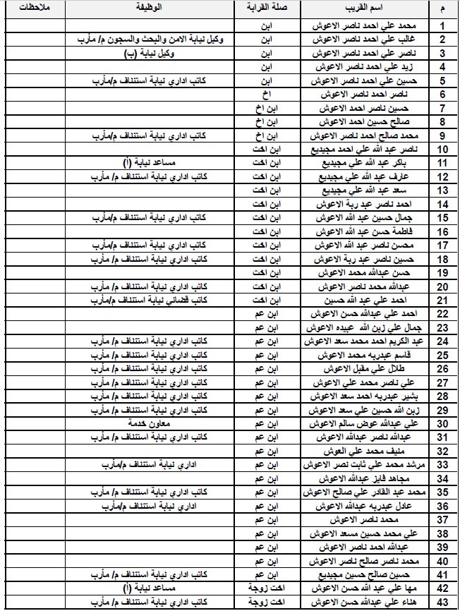 ويرصد الكشف أدناه أفراد عائلة الأعوش وأبناء قريته الموظفين في الجهاز القضائي بعضهم لا يحمل أي مؤهلات عملية، ومع ذلك يشغل وظيفة هامة تتوقف عندها مشاكل المواطنين وقضاياهم، وتم تعيين معظمهم إبان شغل الأعوش منصب النائب العام للجمهورية، بين 2011 - 2022.