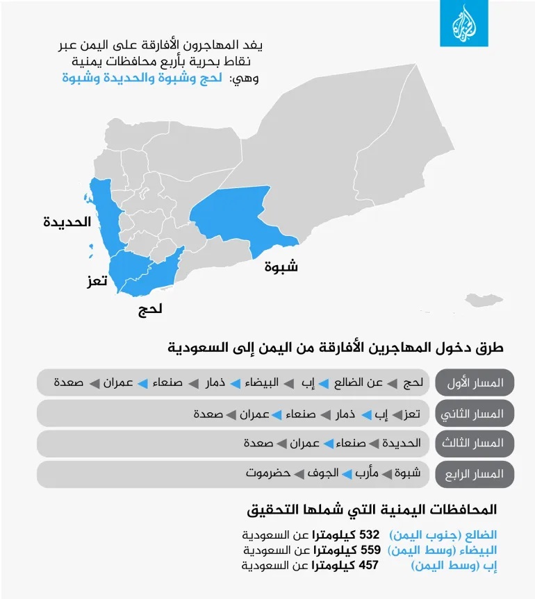 ويسلك هؤلاء 4 مسارات للوصول إلى السعودية، في رحلة تستمر لأسابيع يعبرون خلالها 15 محافظة يمنية: عدن ولحج وتعز والحديدة والضالع وإب والبيضاء وشبوة ومأرب والجوف وحضرموت وذمار وصنعاء وعمران وصعدة.