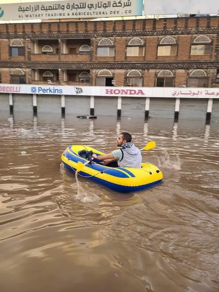 كما أظهرت الصور مواطنين على متن قوارب صيد تجوب شوارع صنعاء.