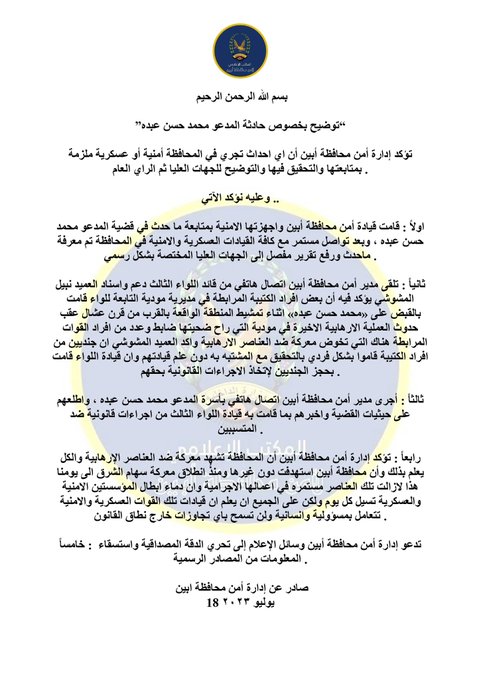وقالت إدارة امن محافظة أبين التابعة للانتقالي في بيان -اطلع عليه يني يمن- إن عناصر في اللواء الثالث دعم وإسناد، التابع للمجلس الانتقالي، يقفون خلف جريمة مقتل المواطن مهدي، جراء التعذيب في سجون الانتقالي بأبين.