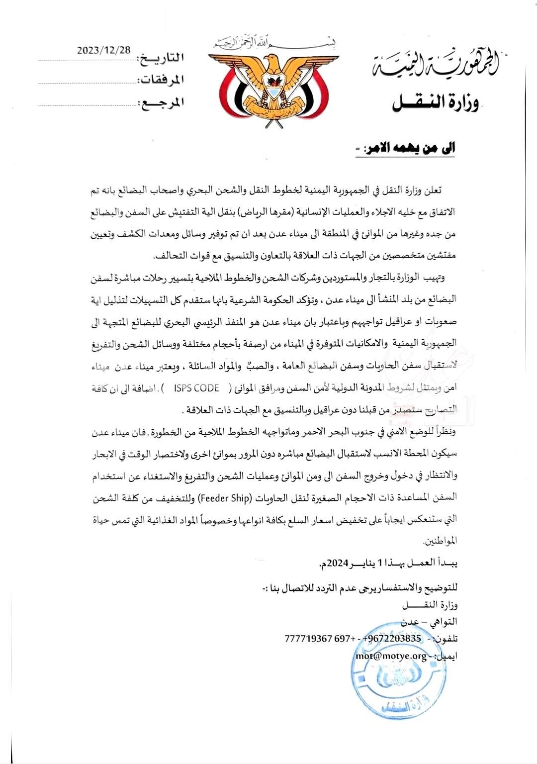 وقالت وزارة النقل، بأن ميناء عدن ميناء آمن ويمتثل لشروط المدونة الدولية لأمن السفن ومرافق الموانئ( ISPS CODE)، اضافة الى أن كافة التصاريح ستصدر من قبل وزارة النقل دون عراقيل وبالتنسيق مع الجهات ذات العلاقة.