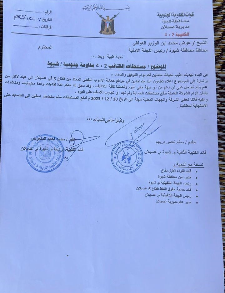 وكشفت الوثائق الموجهة إلى عضو مجلس القيادة الرئاسي، رئيس المجلس الانتقالي الجنوبي "عيدروس الزُبيدي" ومحافظ شبوة "عوض الوزير" ووزير النفط والمعادن في الحكومة اليمنية، ومدراء "الشركة اليمنية للاستثمارات النفطية والمعدنية، وشركة بترومسيلة، وشركة جنت هنت" ان المسلحين سيقومون بالتصعيد -تهديد ضمني بتفجير الانبوب- في حال عدم حصولهم على مستحقاتهم المالية.