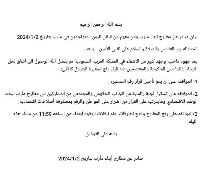 وجاء ذلك في بيان صادر عن مطارح مأرب، ومن معهم من القبائل المحتجين على قرار تحريك سعر المحروقات بالمحافظة "اطلع عليه يني يمن".