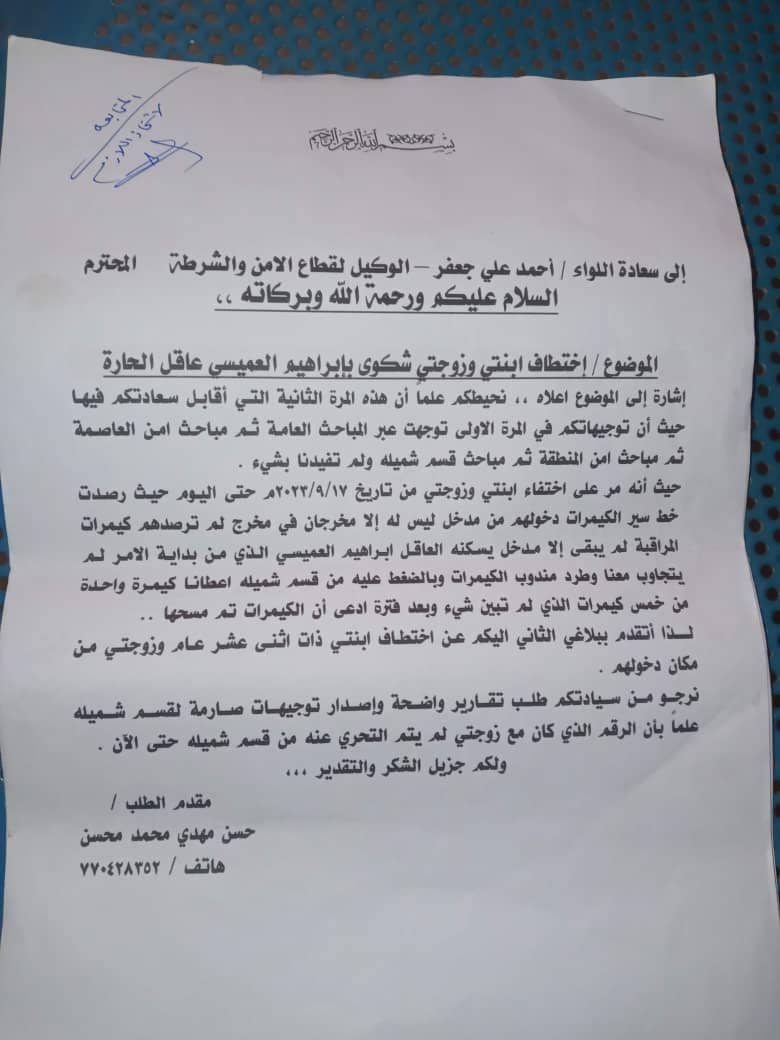 وناشد المواطن اليمني "حسن مهدي محمد" الجهات المختصة التابعة للمليشيات الحوثية، بالكشف عن مصير ابنته وزوجته (من جنسية عربية) وابنتها عقب اختفاءهما في صنعاء بتاريخ 17 سبتمبر 2023 .