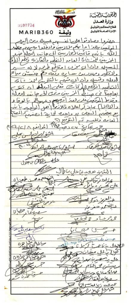 كما أكد الموقعون على الوثيقة القبلية أنهم إلى جانب الدولة وقدموا على هذا وجيههم وعهودهم بالوفاء والالتزام بما ذكر أعلاه، وأنهم مع بعضهم البعض يد واحدة لحماية أرضهم والمصالح العامة وعليه تم التوقيع.