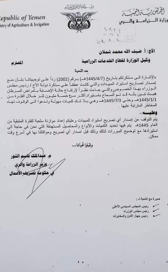كما تطالب الوثيقة إعادة تصدير المبيدات الممنوعة إلى بلد المنشأ والموجودة في ميناء الحديدة.