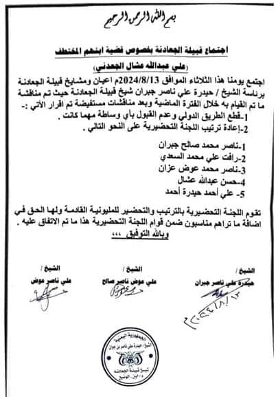 وناقش الاجتماع، الذي عُقد برئاسة الشيخ حيدرة علي ناصر جبران، وبحضور مشايخ وأعيان قبيلة الجعادنة، آخر مستجدات قضية ابنهم المختطف المقدم علي عبدالله عشال الجعدني.