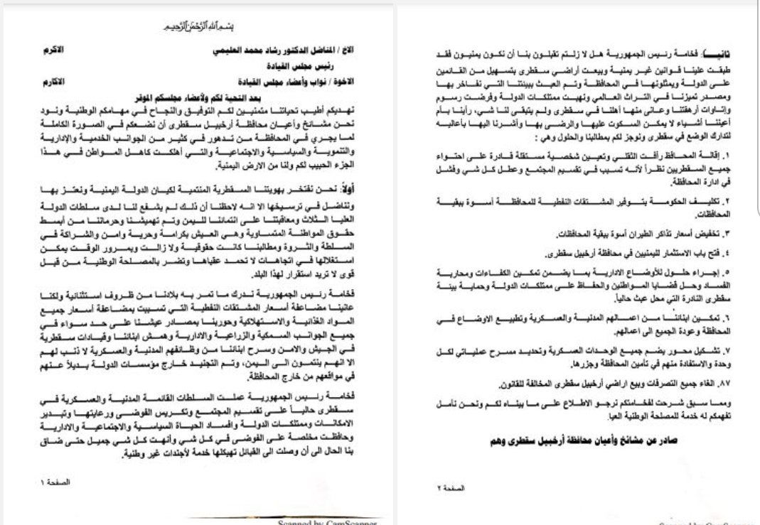كما طالبوا بإجراء إصلاحات إدارية تضمن تمكين الكفاءات ومحاربة الفساد، وحل قضايا المواطنين، والحفاظ على ممتلكات الدولة، وحماية بيئة سقطرى الفريدة التي تتعرض للعبث حاليًا، مع التأكيد على ضرورة تمكين السقطريين من العودة إلى وظائفهم المدنية والعسكرية وتطبيع الأوضاع في المحافظة.