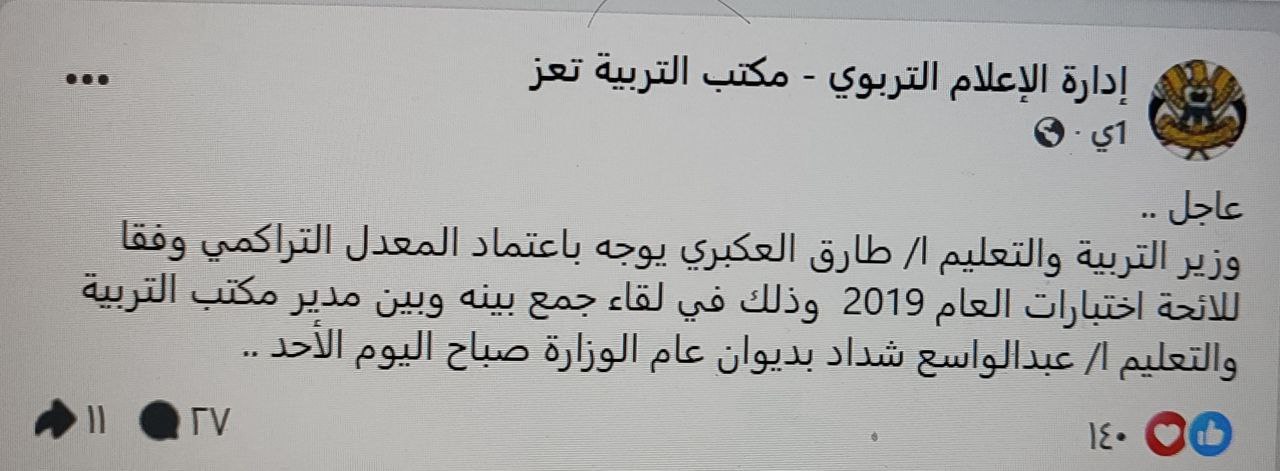 وقال الإعلام التربوي في مكتب التربية بمحافظة تعز، إن وزير التربية والتعليم طارق العبكري، وجه باعتماد المعدل التراكمي لطلاب الثانوية في تعز، وفق اللائحة الاختبارية للعام 2019م، بأن يمنح كل الطلاب المعدل التراكمي.