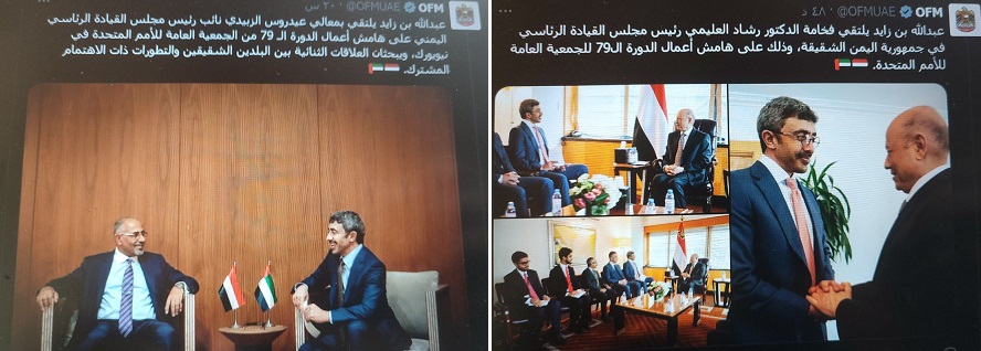 التقى وزير الخارجية الإماراتي، عبدالله بن زايد، برئيس المجلس الرئاسي، رشاد العليمي، وعضو المجلس، عيدروس الزبيدي، في لقاءين منفصلين على هامش اجتماعات الجمعية العامة للأمم المتحدة في دورتها الـ 79التي انطلقت الثلاثاء.