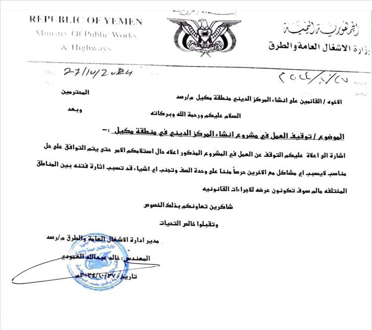 وأظهر تعميم رسمي صادر عن مكتب الأشغال العامة والطرق في مديرية رصد يافع، توجيهات بإيقاف البناء في إنشاء مركز ديني سلفي في المديرية.