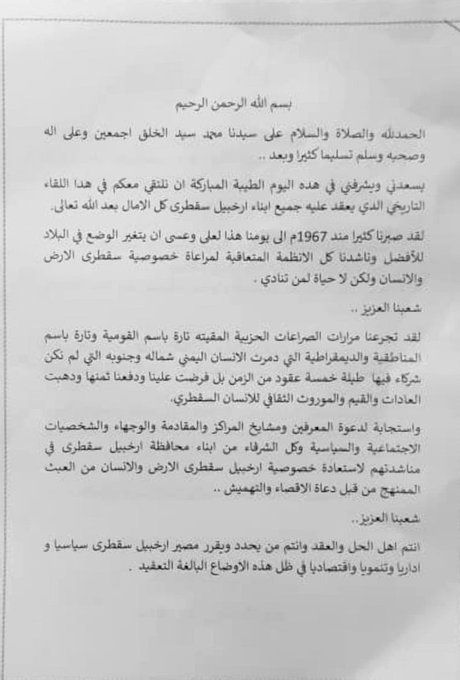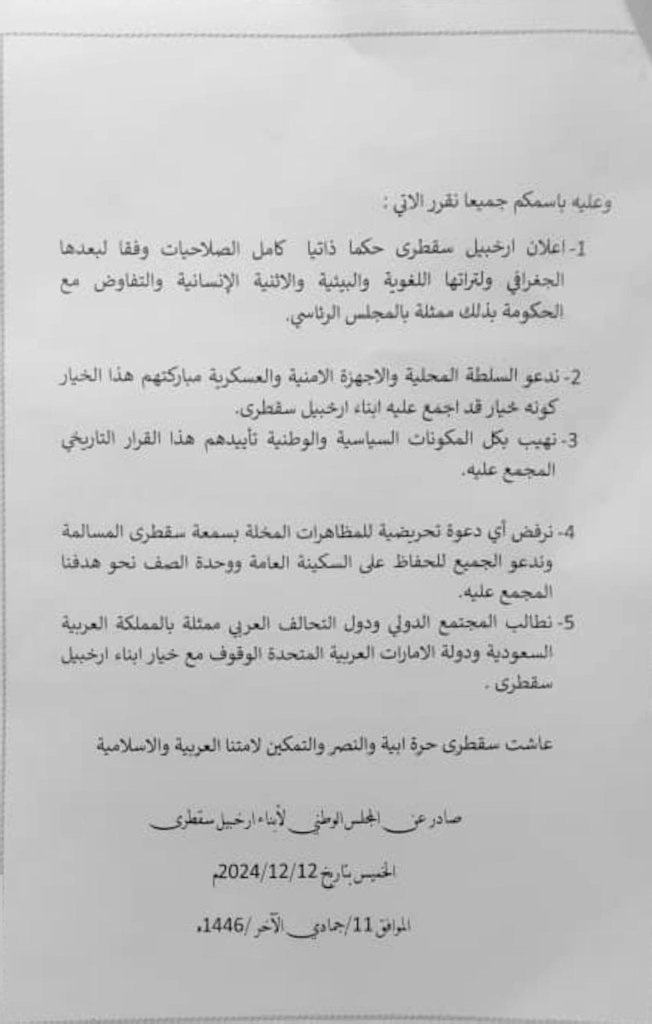 المجلس الانتقالي المدعوم إماراتياً يعلن الحكم الذاتي في جزيرة سقطرى ومسوؤل إماراتي يرحب بالخطوة ( وثيقة)