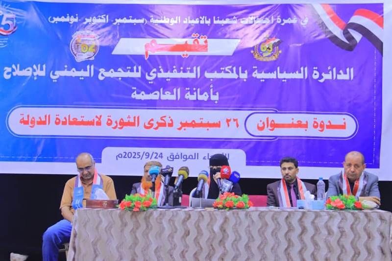عقدت اليوم، بمحافظة مأرب، ندوة سياسية بعنوان " ٢٦ سبتمبر :ذكرى الثورة لاستعادة الدولة" والتي أقامتها الدائرة السياسية للمكتب التنفيذي للتجمع اليمني للإصلاح بأمانة العاصمة، في إطار الاحتفالات بأعياد الثورة ٢٦ سبتمبر المجيدة، و١٤ اكتوبر الخالدة .