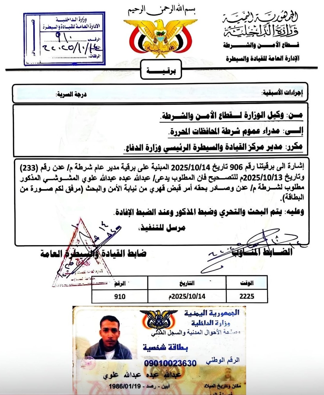 أصدرت وزارة الداخلية – قطاع الأمن والشرطة – أمرًا بالقبض القهري على المدعو "عبد الله عبده عبدالله علوي المشوشي"، أحد ضباط اللواء الثالث دعم وإسناد التابع للمجلس الانتقالي، وذلك بناءً على توجيه من نيابة البحث الجنائي بتاريخ 14 أكتوبر 2025.