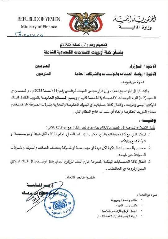وشددت المذكرة على حصر الحسابات البنكية لكل جهة بمختلف العملات في جميع البنوك وشركات الصرافة، وإغلاق الحسابات المفتوحة خارج البنك المركزي اليمني، مع نقل أرصدتها بشكل كامل إلى البنك المركزي وفروعه في المحافظات، تعزيزاً للشفافية والرقابة المالية على المال العام.