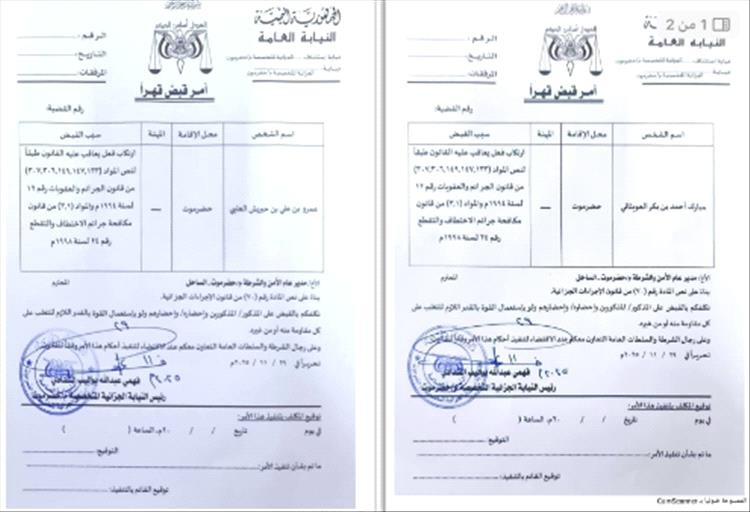 وبحسب وثيقتين قضائيتين صادرتين عن نيابة استئناف – الجزائية المتخصصة بحضرموت، فإن الأوامر تستند إلى المواد 133، 147، 149، 6، 307 من قانون الجرائم والعقوبات رقم 12 لسنة 1994، إضافة إلى مواد من قانون مكافحة الاختطاف والتقطع رقم 24 لسنة 1998.