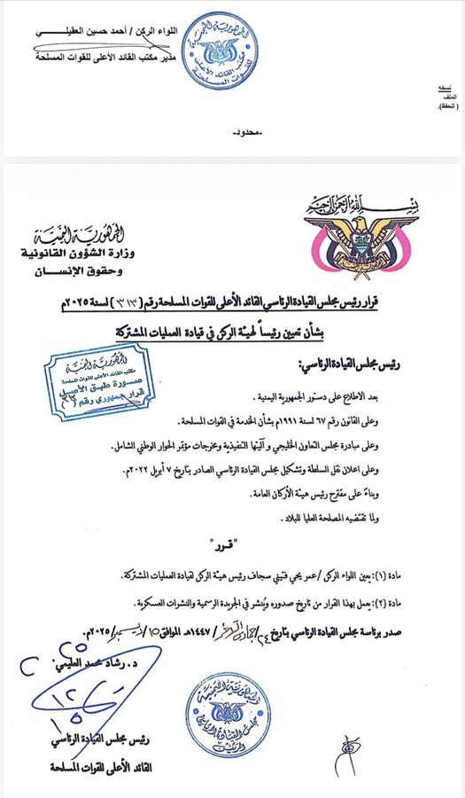 ويأتي هذا القرار في سياق الجهود الرامية إلى تطوير الأداء الإداري والفني والقتالي للقوات المسلحة اليمنية، وتعزيز كفاءة العمل داخل غرفة العمليات المشتركة، بما يواكب التحديات الميدانية والمرحلة الراهنة التي تمر بها البلاد.
