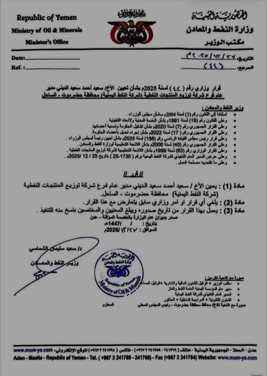 ونصّت المادة الأولى من القرار على تعيين الأخ سعيد أحمد سعيد الديني مديراً عاماً لفرع شركة توزيع المنتجات النفطية بمحافظة حضرموت – الساحل، استناداً إلى عرض المدير العام التنفيذي لشركة النفط اليمنية المؤرخ في 25 ديسمبر 2025م، وبما تقتضيه مصلحة العمل في هذا القطاع الحيوي.