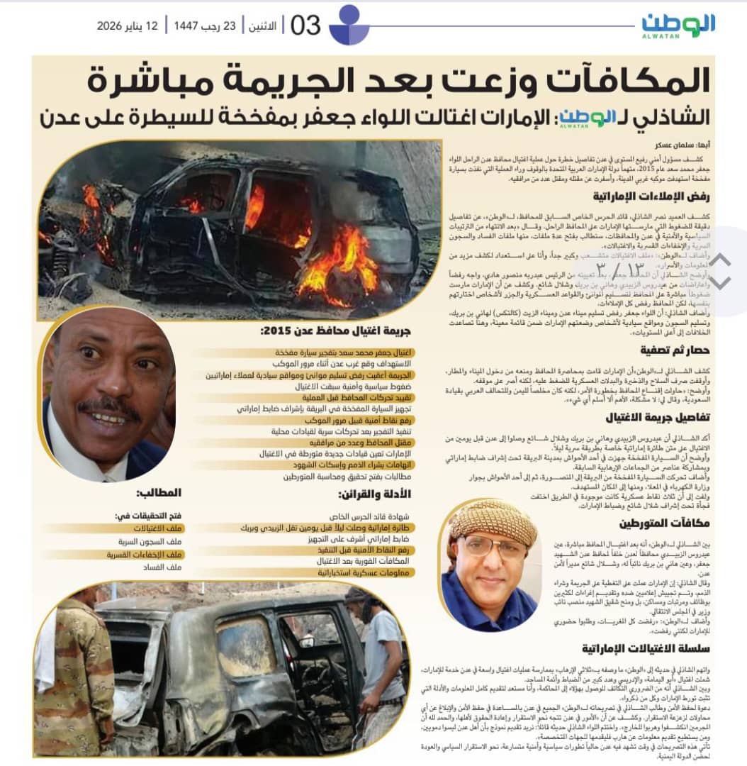 ونقلت صحيفة «الوطن» السعودية عن العميد نصر الشاذلي، القائد السابق للحرس الخاص لمحافظ عدن، ما وصفه بتفاصيل دقيقة حول الضغوط التي قال إن الإمارات مارستها على المحافظ الراحل، مؤكدًا أن الفترة المقبلة ستشهد فتح ملفات «خطيرة» تتعلق بالفساد، والسجون السرية، وحالات الإخفاء القسري، إضافة إلى سلسلة الاغتيالات التي شهدتها عدن خلال السنوات الماضية.