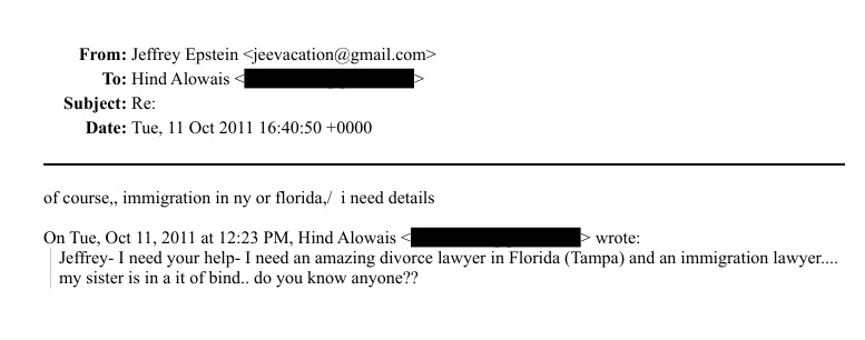 وتكشف الوثائق عن اعتماد العويس على إبستين في قضايا حساسة؛ إذ كتبت له في إحدى الرسائل: "بنك تشيس سرق أموالي، ماذا أفعل؟"، فدعاها فوراً لبحث مقاضاتهم، كما طلبت مساعدته في تأمين محامي طلاق رفيع ومحامي هجرة لشقيقتها، ليتولى إبستين ترتيب لقاء مع محاميه الشخصي ريد وينغارتن.
