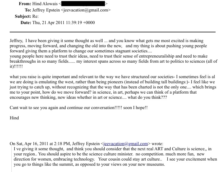 وفي جانب آخر، كشفت المراسلات رغبة العويس في ترك منصبها الدبلوماسي، وسؤالها لإبستين: "كيف أجني المال؟"، ليعرض عليها التدخل لتسهيل فرص عمل وإقامة في الولايات المتحدة ودبي.