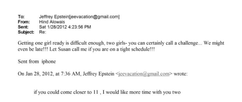أما بشأن ما أثير حول رسالة تتحدث عن "تجهيز فتاتين"، فقد أوضحت الوثائق أن المقصود كان هند وشقيقتها هالة لحضور موعد مع إبستين، وليس كما أُشيع عن تورطها في تجنيد فتيات، وفق ما أكدته سجلات المواعيد المنشورة.