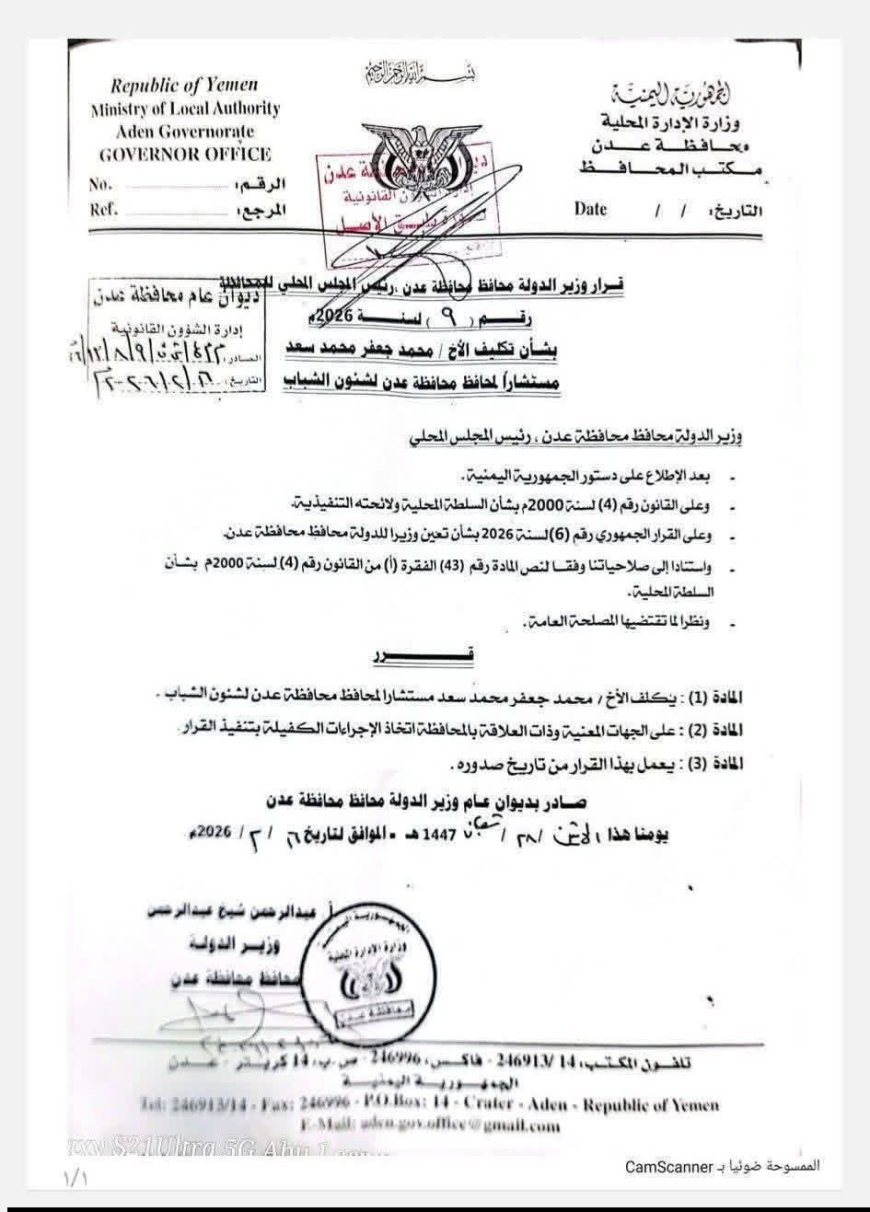 أصدر معالي وزير الدولة، محافظ محافظة عدن، الأستاذ عبدالرحمن شيخ عبدالرحمن، اليوم الاثنين، القرار رقم (9) لعام 2026م، والذي يقضي بتكليف مستشار للمحافظ مختص بشؤون الشباب، في إطار خطة السلطة المحلية لتفعيل دور الكوادر الشابة وإدماجها في العمل التنموي.