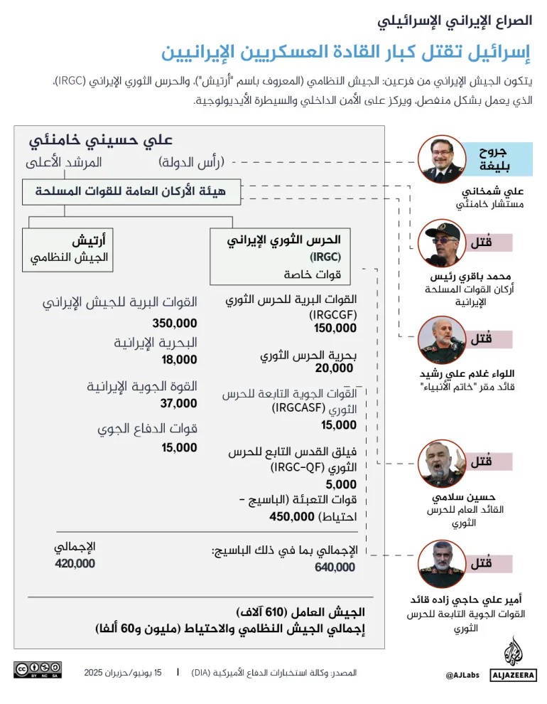 أسفرت الهجمات الإسرائيلية يوم 15 يونيو/ حزيران 2025 عن مقتل ما لا يقل عن 4 قادة كبار في الحرس الثوري الإسلامي (آي آر جيه سي)، بمن فيهم القائد الأعلى حسين سلامي.