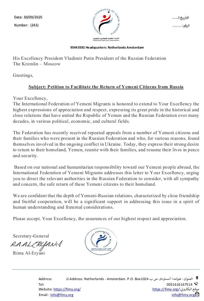 الاتحاد العالمي للمهاجرين اليمنيين يناشد بوتين: أعيدوا شبابنا من جبهات القتال في روسيا ( بيان)