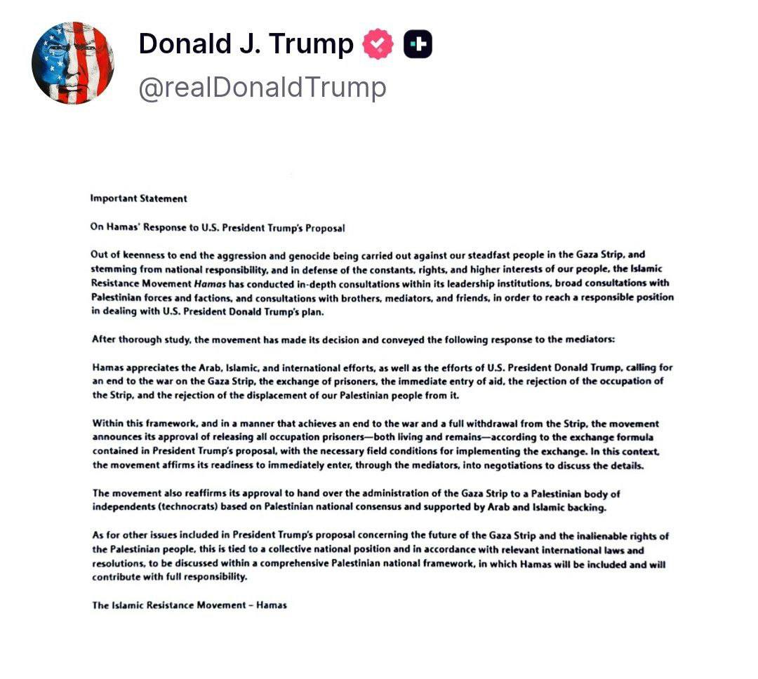 وجاء في نص البيان أن حماس "تثمّن الجهود العربية والإسلامية والدولية، وكذلك جهود الرئيس الأمريكي، الداعية إلى وقف الحرب على قطاع غزة وتبادل الأسرى ودخول المساعدات فوراً، وترفض أي خطط لاحتلال القطاع أو تهجير سكانه". كما أعلنت موافقتها على "الإفراج عن جميع أسرى الاحتلال، أحياء وجثامين، وفق صيغة التبادل الواردة في مقترح ترامب"، مشيرة إلى استعدادها للدخول في مفاوضات عاجلة عبر الوسطاء لمناقشة التفاصيل.