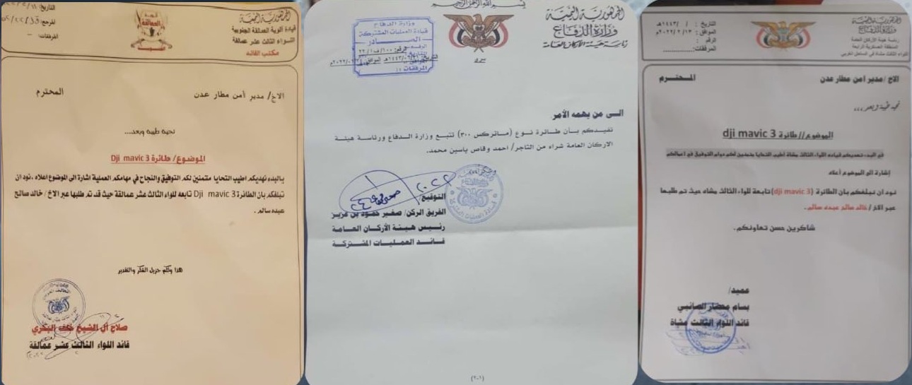 ووفقًا للوثائق منصة "أبناء عدن"، فقد قام خالد اليافعي بشراء طائرات تصوير بدون طيار (Dji Mavic 3) لصالح القسم الإعلامي لقوات عسكرية يمنية، بينها اللواء الثالث عشر عمالقة، ووزارة الدفاع، ورئاسة هيئة الأركان العامة، واللواء الثالث مشاة.