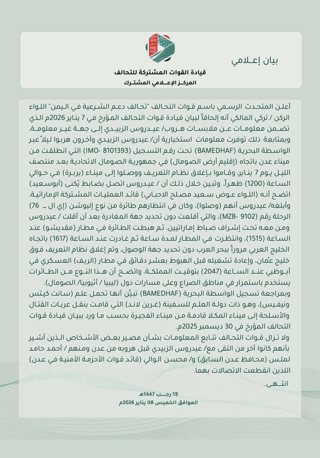 أعلن المتحدث الرسمي باسم تحالف دعم الشرعية في اليمن، اللواء الركن تركي المالكي، أن قيادة قوات التحالف توصلت إلى معلومات استخبارية تفصيلية حول ملابسات مغادرة عيدروس الزبيدي من مدينة عدن، وذلك إلحاقاً بالبيان الصادر بتاريخ 7 يناير 2026.