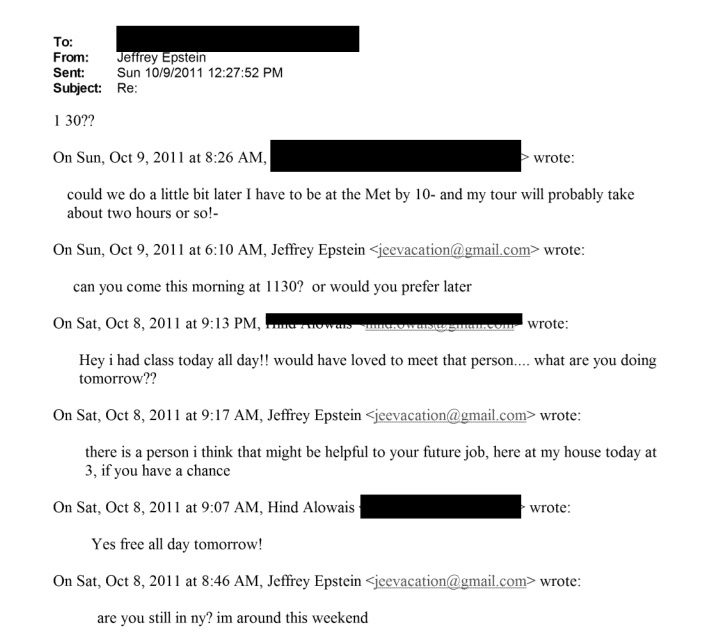 أما بشأن ما أثير حول رسالة تتحدث عن "تجهيز فتاتين"، فقد أوضحت الوثائق أن المقصود كان هند وشقيقتها هالة لحضور موعد مع إبستين، وليس كما أُشيع عن تورطها في تجنيد فتيات، وفق ما أكدته سجلات المواعيد المنشورة.