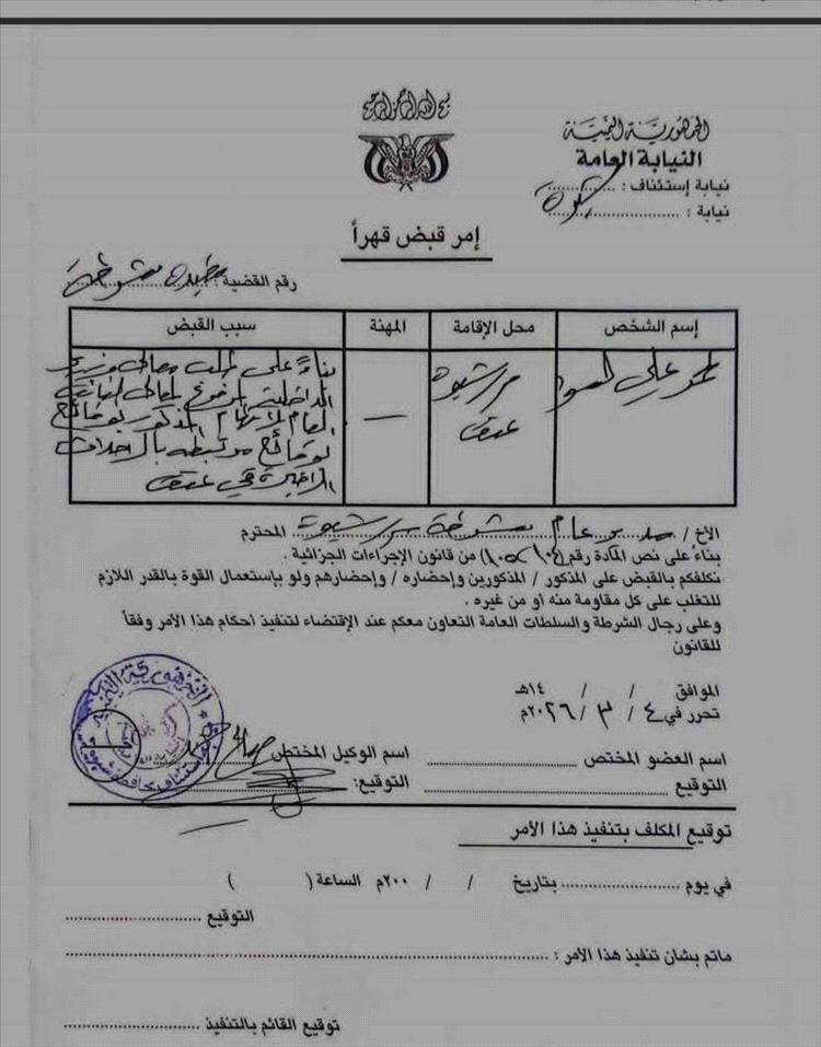 كما أن الوثائق صورة من أمر النفاذ عن النيابة العامة، متضمنة بيانات الشخص المطلوب ضبطه ومكان محدد في محافظة شبوة، إلى جانب توجيهات شفافة للأجهزة الأمنية، وأمر القبض وحضاره للجهات القانونية ممنوع قانونيا.