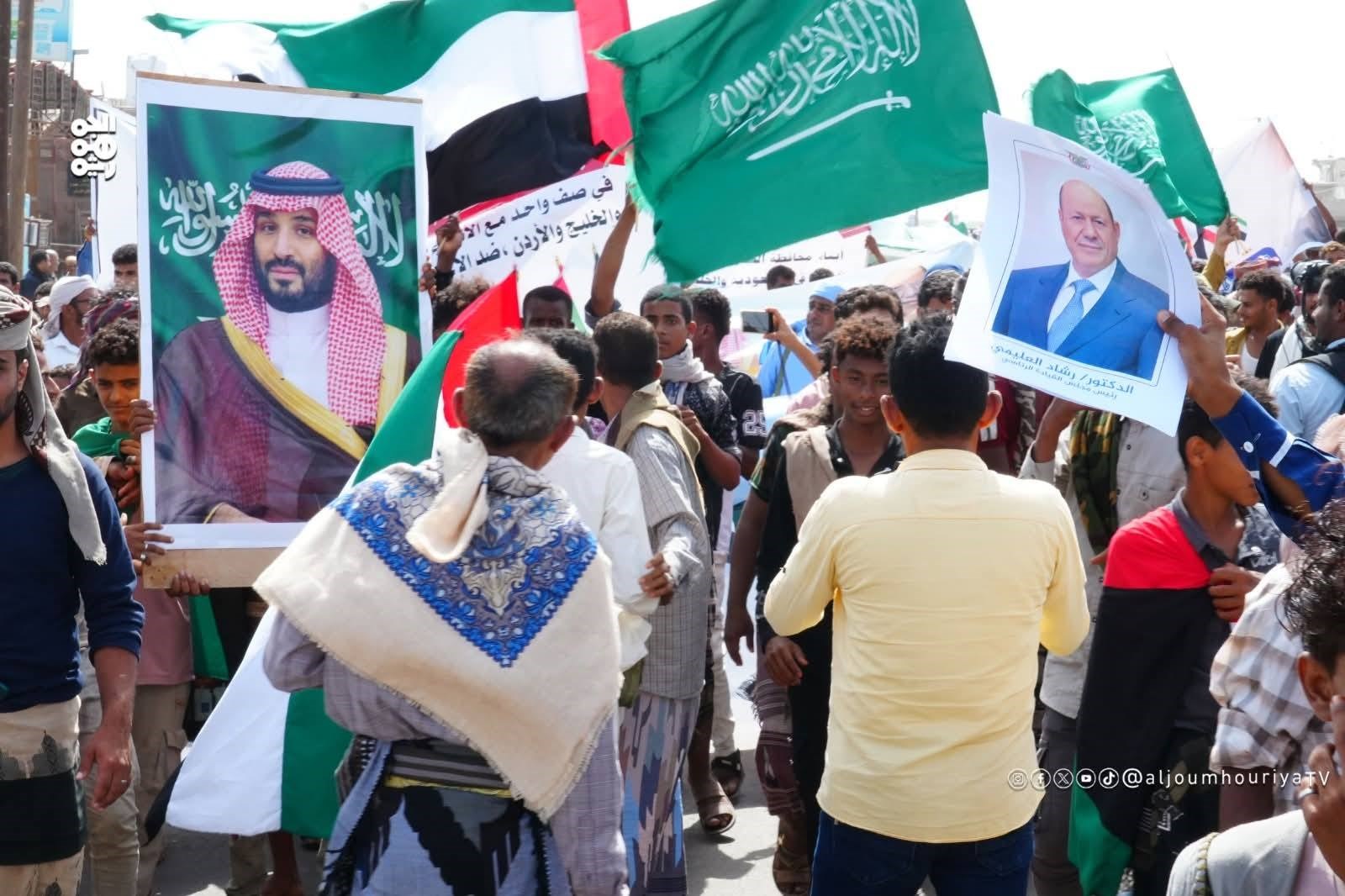 كما رفع المحتشدون صور رئيس مجلس القيادة الرئاسي، إلى جانب صور خادم الحرمين الشريفين الملك سلمان بن عبدالعزيز، وولي العهد الأمير محمد بن سلمان، في رسالة رمزية تؤكد الوفاء للمواقف السعودية الداعمة لليمن، وتُبرز عمق الشراكة والمصير المشترك بين الجانبين.